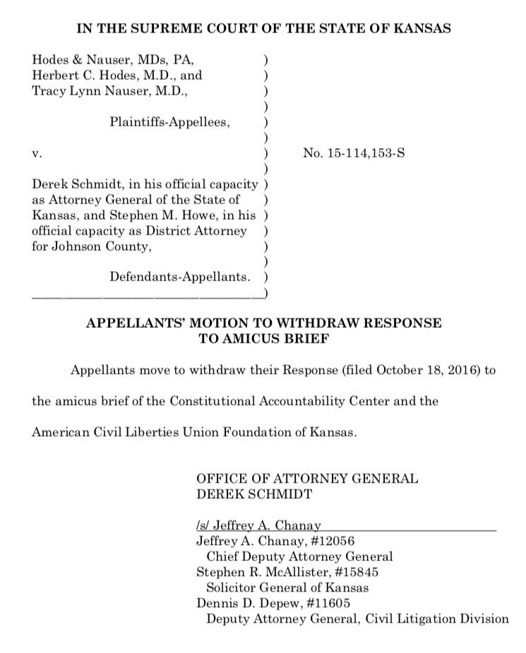 Schmidt submitted a request to the Kansas Supreme Court to withdraw the brief, which is a good thing. I mean, Kansas officials will obviously continue to try to strip women of their human rights—that’s what they do—but they don’t have to be so awful about it.